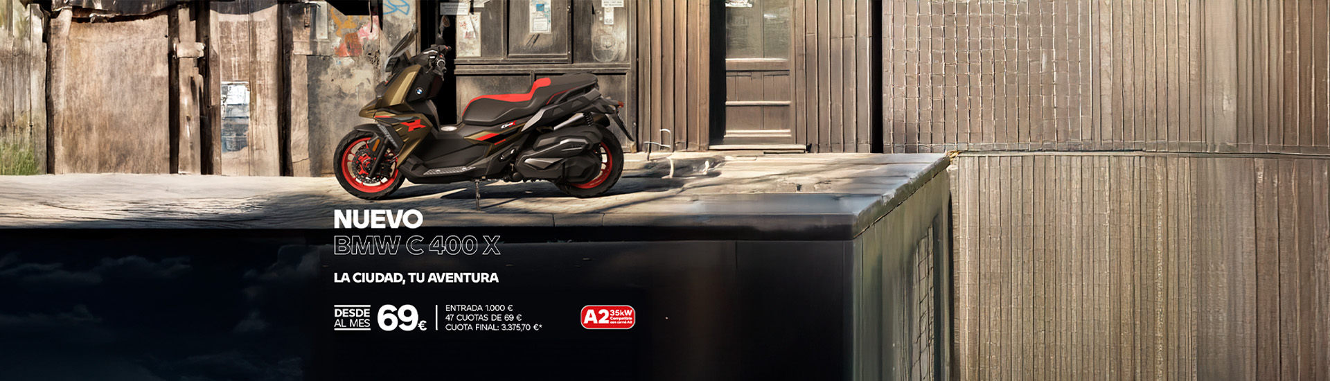 *TAE: 5,65 %TIN: 4,99 %. Importe a financiar: 5.706,28 €. 48 meses. 47 cuotas de 69 €/mes. Comisión de formalización al contado: 85,02 € (1,49 %). Importe total adeudado: 6.703,72 €. Precio total a plazos financiado con BMW Bank: 7.703,72 € (Cumpliendo condiciones). Condiciones válidas hasta 31/12/2025. Precio de venta al contado para BMW C 400 X con Connected Ride: 7.690 € (transporte, descuento e impuestos incluidos. Gastos de matriculación y pre-entrega no incluidos).