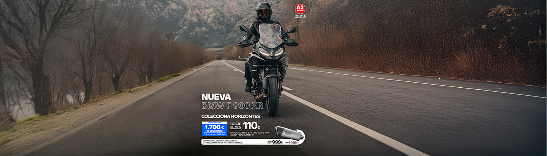 *TAE: 7,77 %. TIN: 6,99 %. Importe a financiar: 8.612,21 €. 48 meses. 47 cuotas de 110 €/mes. Comisión de formalización al contado: 128,32 € (1,49 %). Importe total adeudado: 10.717,82 €. Precio total a plazos financiando con BMW Bank: 13.355,61 € (Cumpliendo condiciones). Condiciones válidas hasta 31/12/2025. Precio de venta al contado para BMW F 900 XR: 12.950 € (transporte, descuento e impuestos incluidos. Gastos de matriculación y pre-entrega no incluidos).