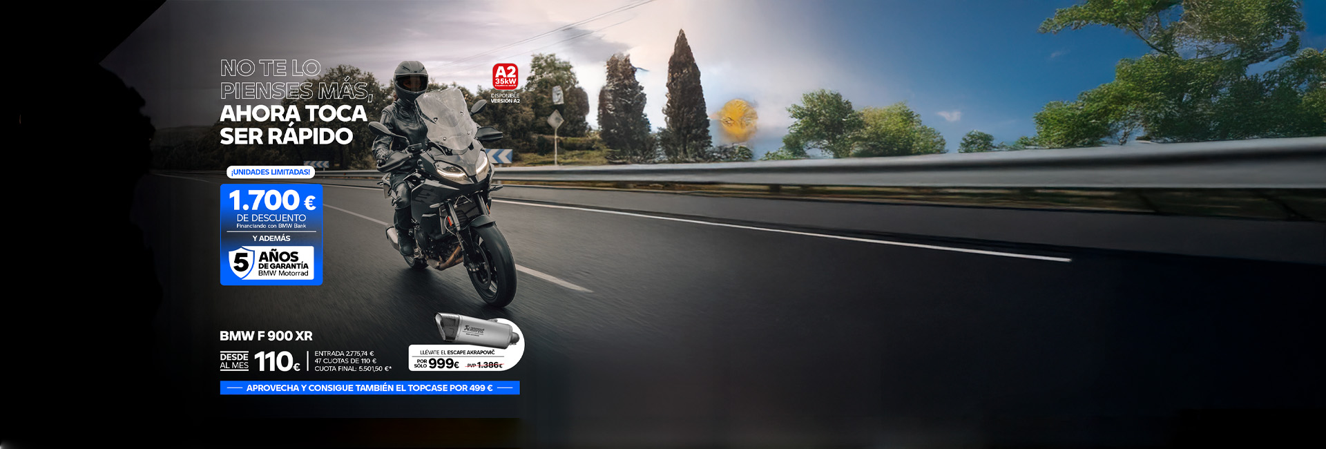 *TAE: 7,77 %TIN: 6,99 %. Importe a financiar: 8.674,26 €. 48 meses. 47 cuotas de 110 €/mes. Comisión de formalización al contado: 129,25 € (1,49 %). Importe total adeudado: 10.800,75 €. Precio total a plazos financiado con BMW Bank: 13.576,49 € (Cumpliendo condiciones). Condiciones válidas hasta 31/03/2026. Precio de venta al contado para BMW F900XR: 13.150 € (transporte, descuento e impuestos incluidos. Gastos de matriculación y pre-entrega no incluidos).