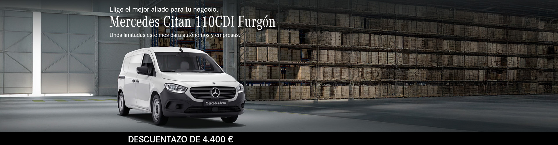 * Ejemplo de Mercedes-Benz Renting para empresas y autónomos, marca comercializada por Mercedes-Benz Renting, S.A.U, para un CITAN (420) – Nueva Citan 110 CDI Furgón, por 404,70€ sin IVA, aportación inicial de 0,00€ sin IVA, a 72 meses y 25.000 kilómetros anuales. Servicios incluidos: Asist+Vhc Sust Accid FLEX; Gastos Matriculación FSL; Gestión de Multas FSL; ITV FSL; Impuesto Municipal FSL; Mnto estandar Van; Neumáticos Renting FSL; TR c/Fr 600 VAN Caser. Válido para ofertas realizadas y vehículos matriculados hasta el 31/12/2024 solicitudes aprobadas hasta el 15/01/2025 y contratos activados hasta el 28/02/2025. Permanencia mín. 24 meses. Oferta no válida para Andorra y Gibraltar.