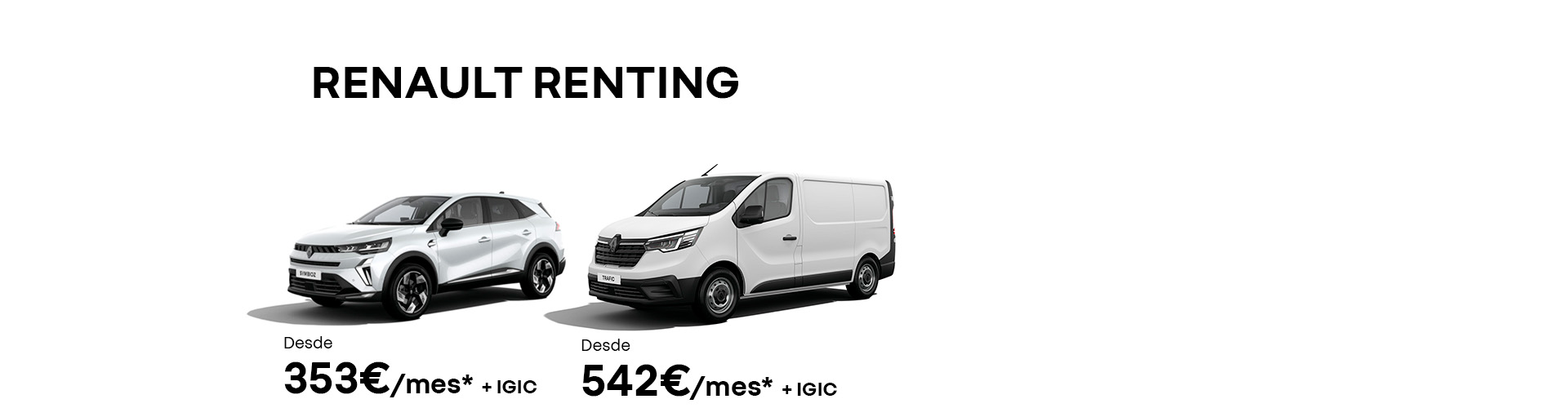*RENAULT TRAFIC: Cuotas de renting para autónomos y pymes sin IGIC calculadas a 60 meses / 75.000 kms. Incluye alquiler, gastos de matriculación, mantenimiento, 4 neumáticos, seguro auto a todo riesgo, Mobilize Fleet Connect Basic, impuestos sucesivos, ITV, asistencia en carretera y gestión de multas. Las imágenes publicitadas pueden no coincidir con el modelo en promoción. Promoción válida del 01 al 28 de febrero de 2025 para unidades limitadas